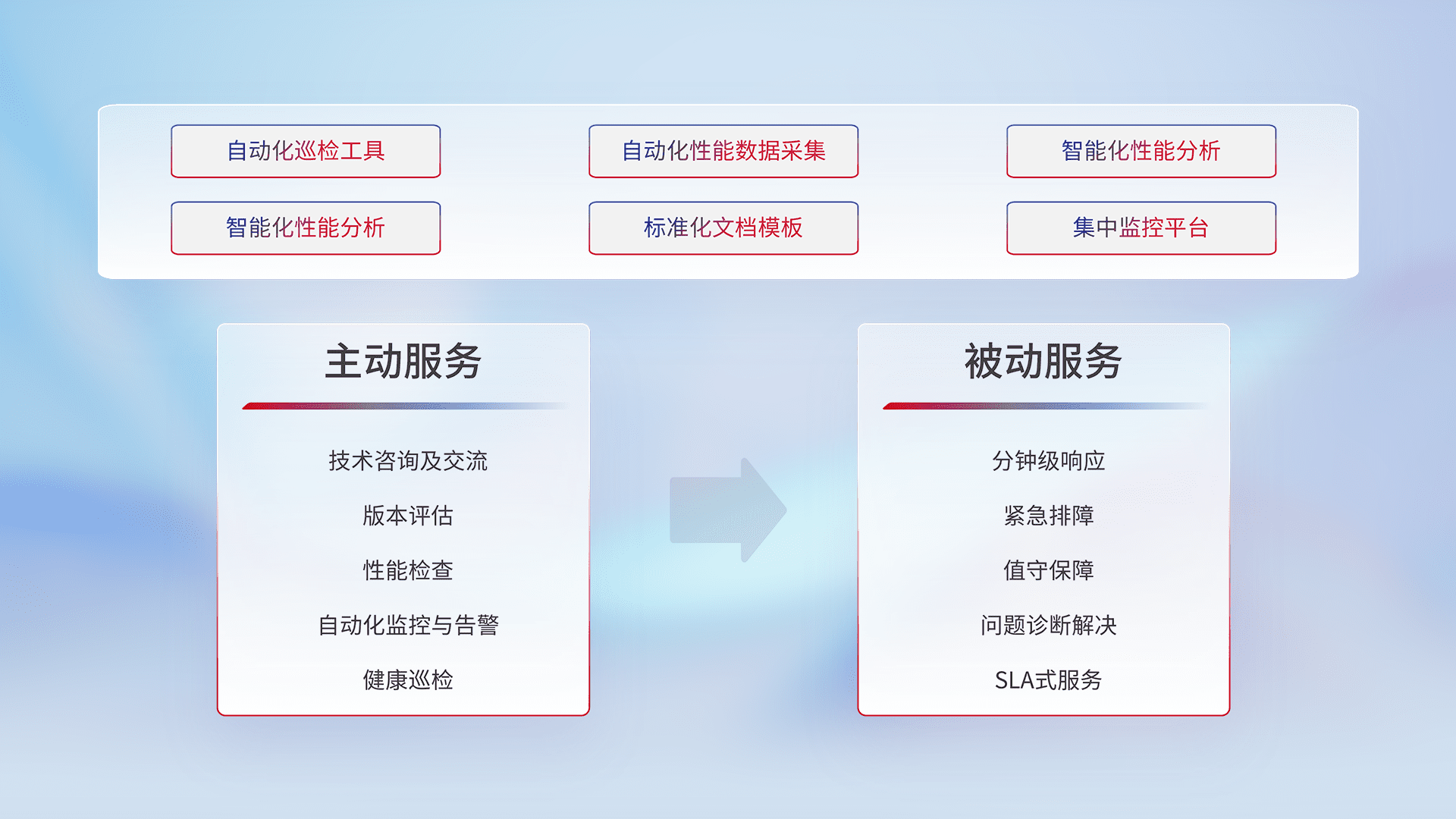 智能化工具和标准化文档,,,,保障服务质量,,,,提供主动服务(包含技术咨询、、版本评估、、、性能检查、、自动化监控与告警、、健康巡检)和被动服务包含(分钟级响应、、紧急排障、、、值守保障、、问题诊断解决、、、SLA服务)。。。